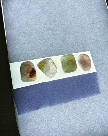 4 Exemplares de Fluorites de diferentes tonalidades, de valor económico. Uma das fotografias está em contra-luz para ver as suas cores e inclusões internas.