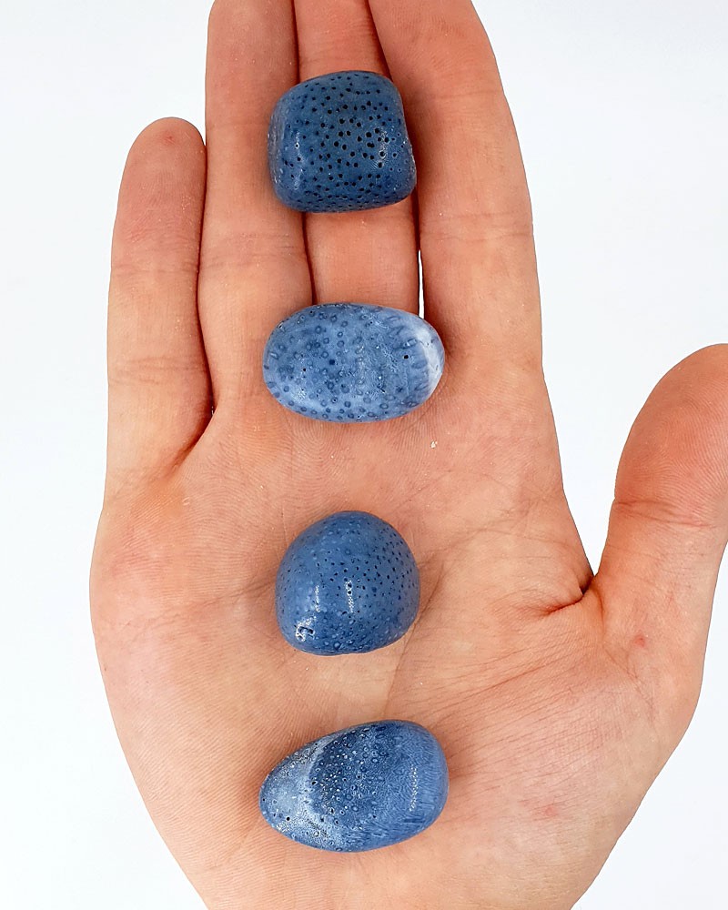 O Coral Azul não é um mineral, mas sim os restos secos de Heliopora Coerulea e várias espécies relacionadas de corais marinhos. Quando seco, fica com um belo azul brilhante e uma forma dura que tem sido usada para fazer joias há séculos. Não devem no entanto ser novamente submergidos em água pois podem rachar ou partir.
