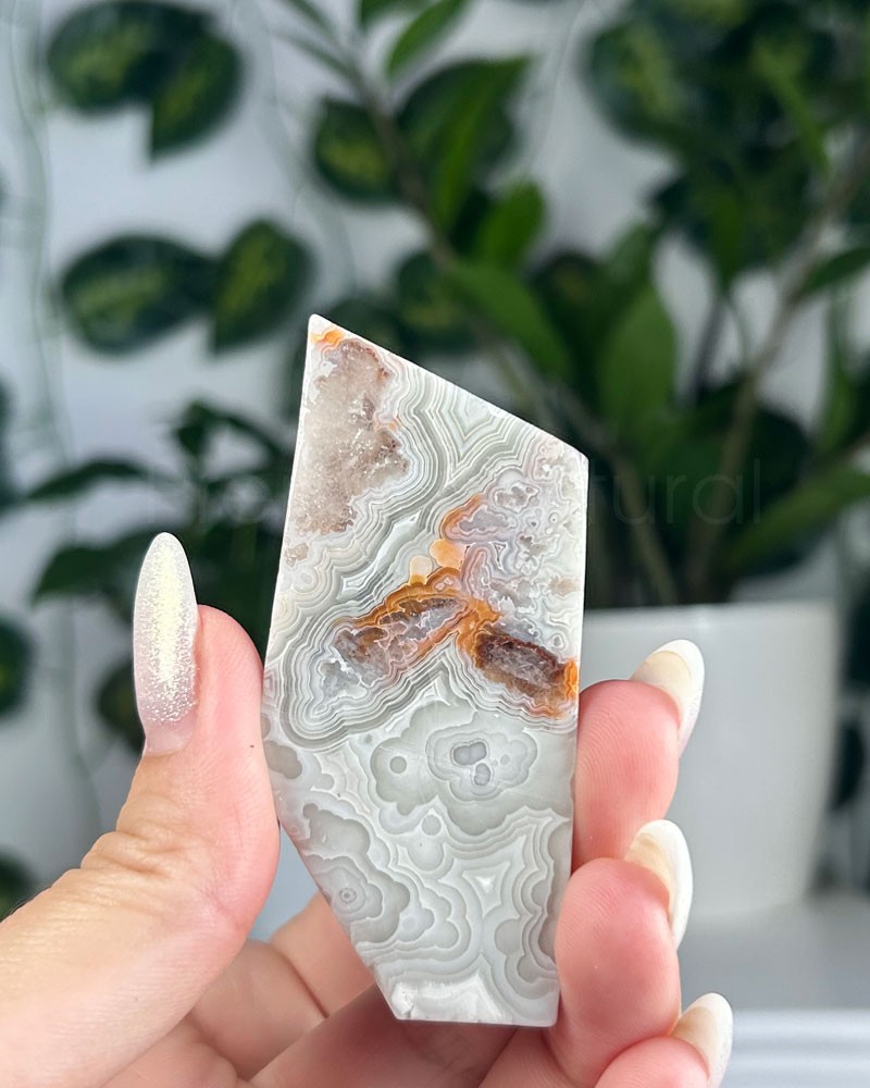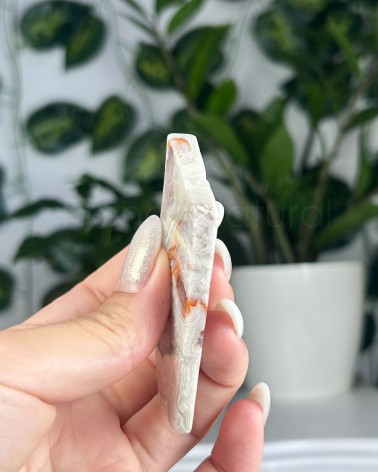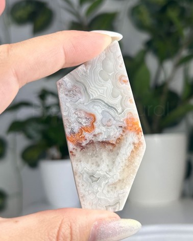 A ágata mexicana apresenta um padrão de texturas e cores, de sensação energizante, que trabalha os chakras plexo solar e base.