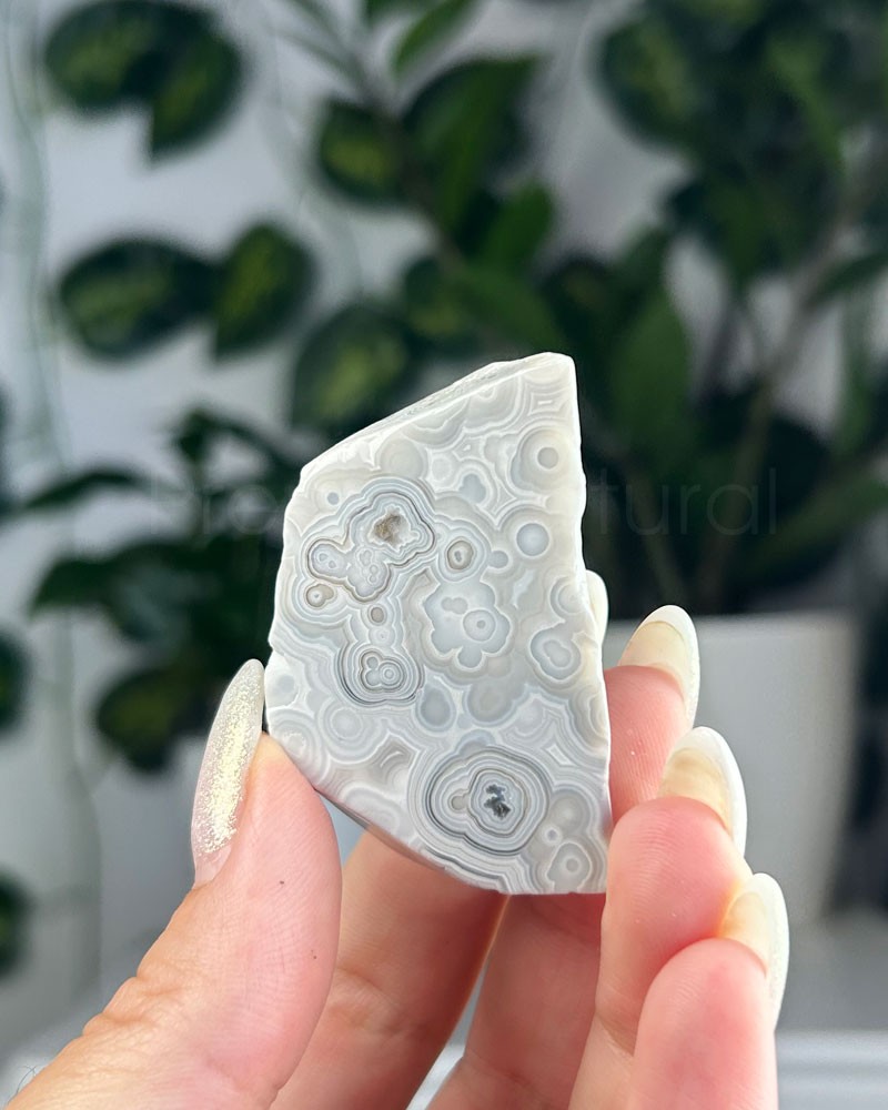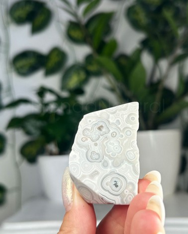 A ágata mexicana apresenta um padrão de texturas e cores, de sensação energizante, que trabalha os chakras plexo solar e base.