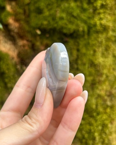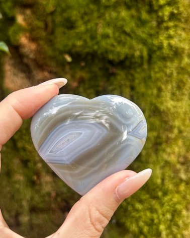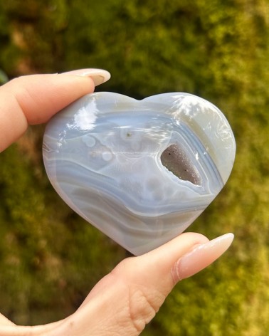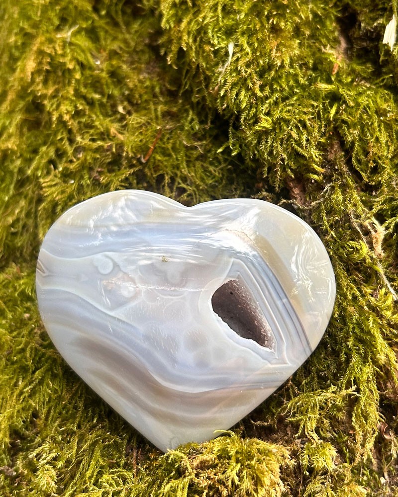 Belos exemplares de corações em ágata natural, onde se contempla uma zona com geodo, com micro cristais de quartzo.